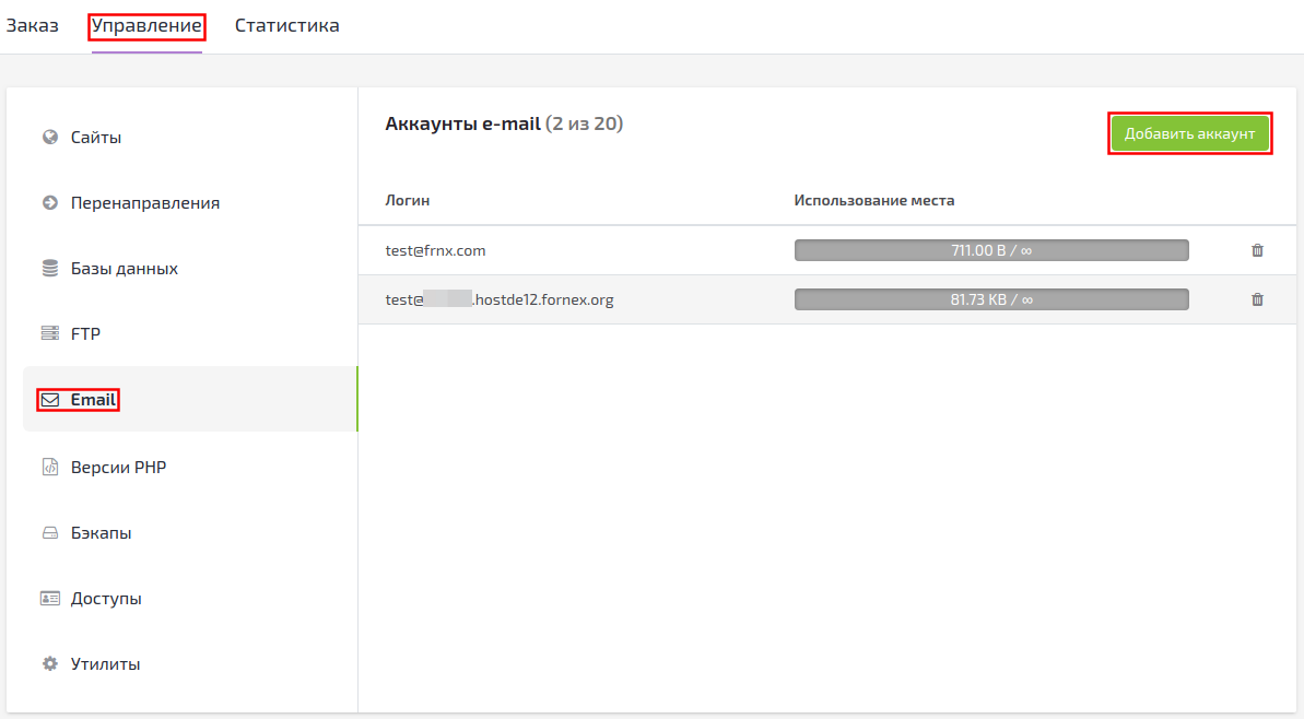 - Здесь у вас также есть возможность добавить или удалить Email-аккаунт, указать Email для домена и квоту на дисковое пространство для аккаунта.
