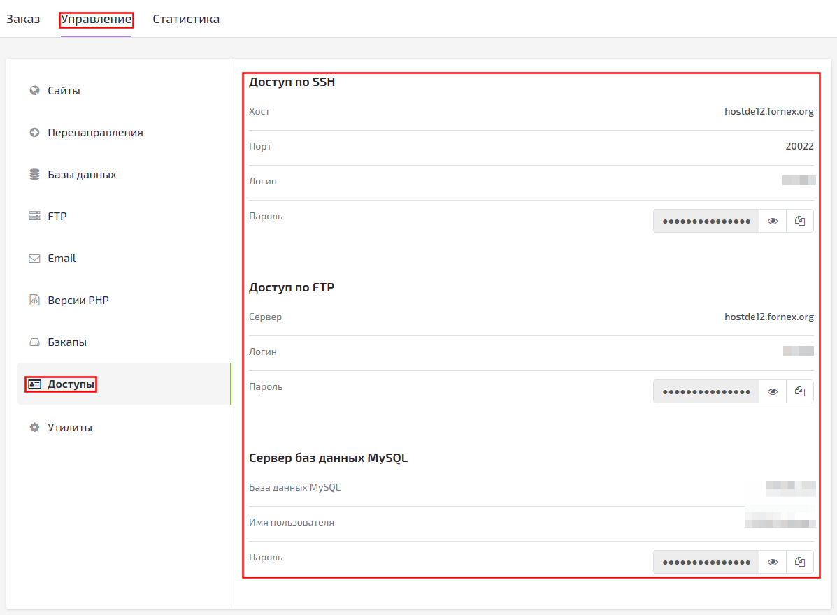 В этом разделе вы можете выполнять технические операции с вашим заказом, не используя панель управления cPanel: