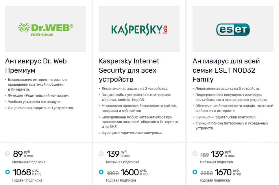 Телекоммуникационная компания предлагает клиентам выбрать оптимальный вариант подписки на программу, остановившись на одном из нескольких доступных вариантов подключения. При этом использовать услугу можно как на одном устройстве, так и на нескольких выбранных абонентом компьютерах, ноутбуках или телефонах. Главное, не забывать своевременно пополнять баланс и активировать антивирус.